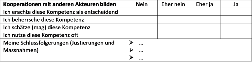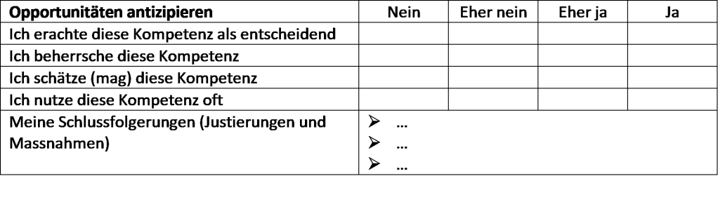 Ich beschreibe diese Schlüsselkompetenzen eine nach der anderen und biete Ihnen einen Selbstcheck für Ihre eigene Bewertung/Reflexion an. Dadurch können Sie die Bedeutung (die Sie der Kompetenz beimessen) mit Ihrer Virtuosität, Ihrer Affinität und der Intensität (mit der Sie die Kompetenz einsetzen) vergleichen. Durch diesen Vergleich können Sie entscheiden, ob Justierungen oder Massnahmen notwendig sind.